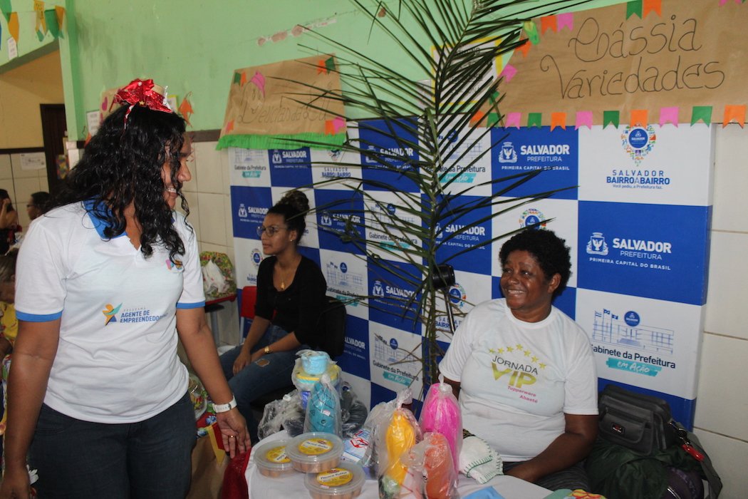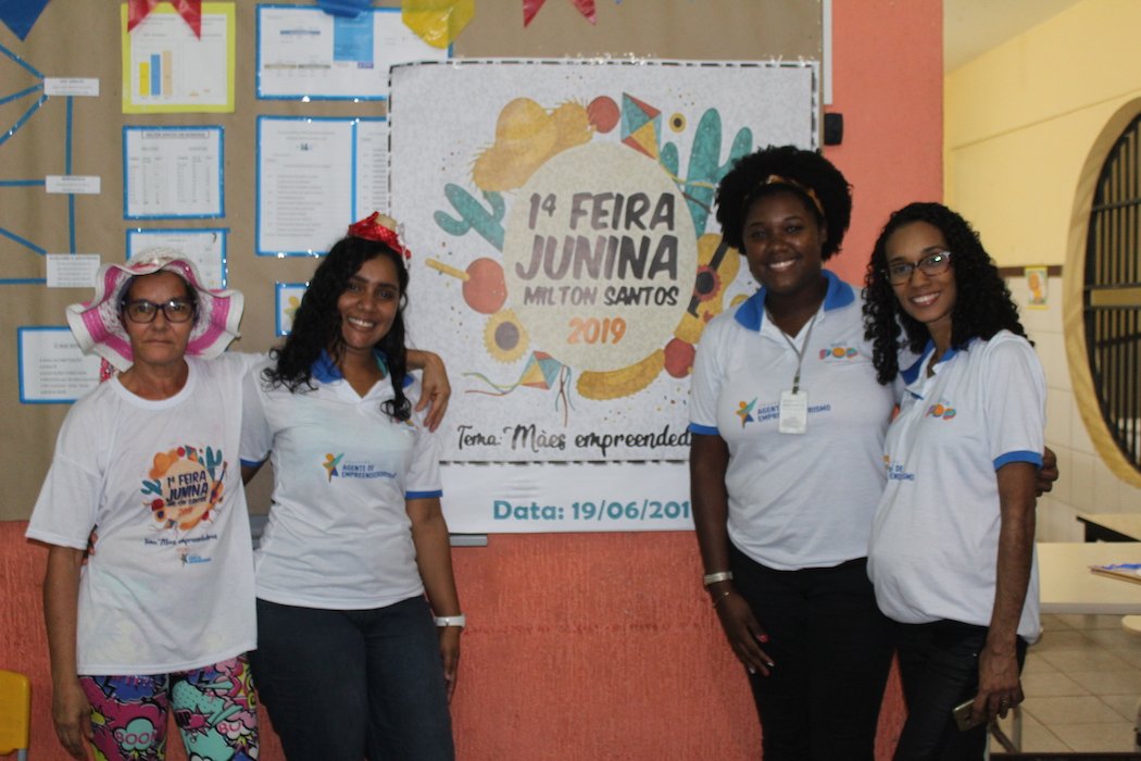 A 1ª Feira junina da Escola Municipal Milton Santos, sediada no bairro de Valéria, ganhou neste ano um toque especial. Três Agentes de Empreendedorismo se uniram e levaram para participar da comemoração 20 empreendedoras integrantes do Programa Agente de Empreendedorismo que montaram barraquinhas onde puderam vender bolos, quitutes, bebidas e artesanatos para a comunidade.