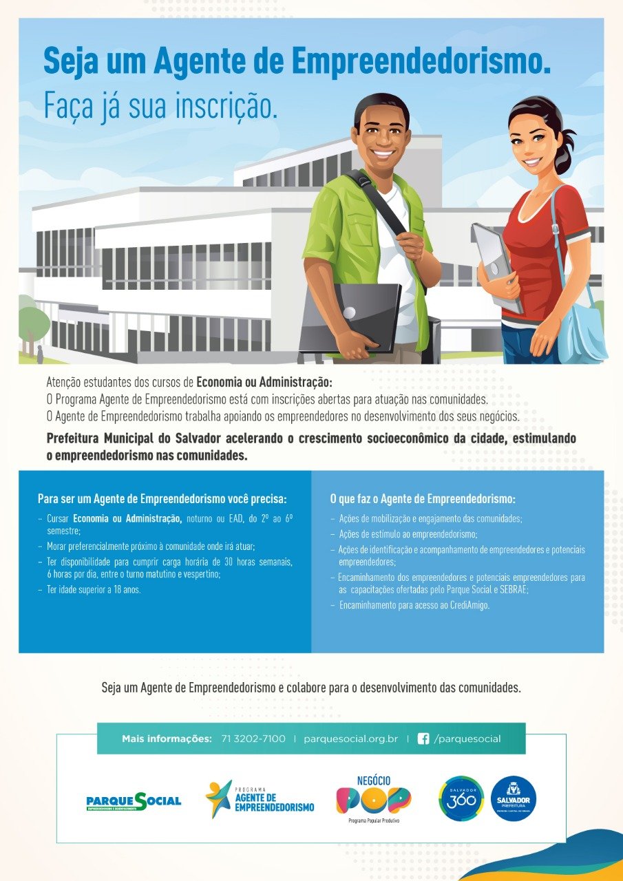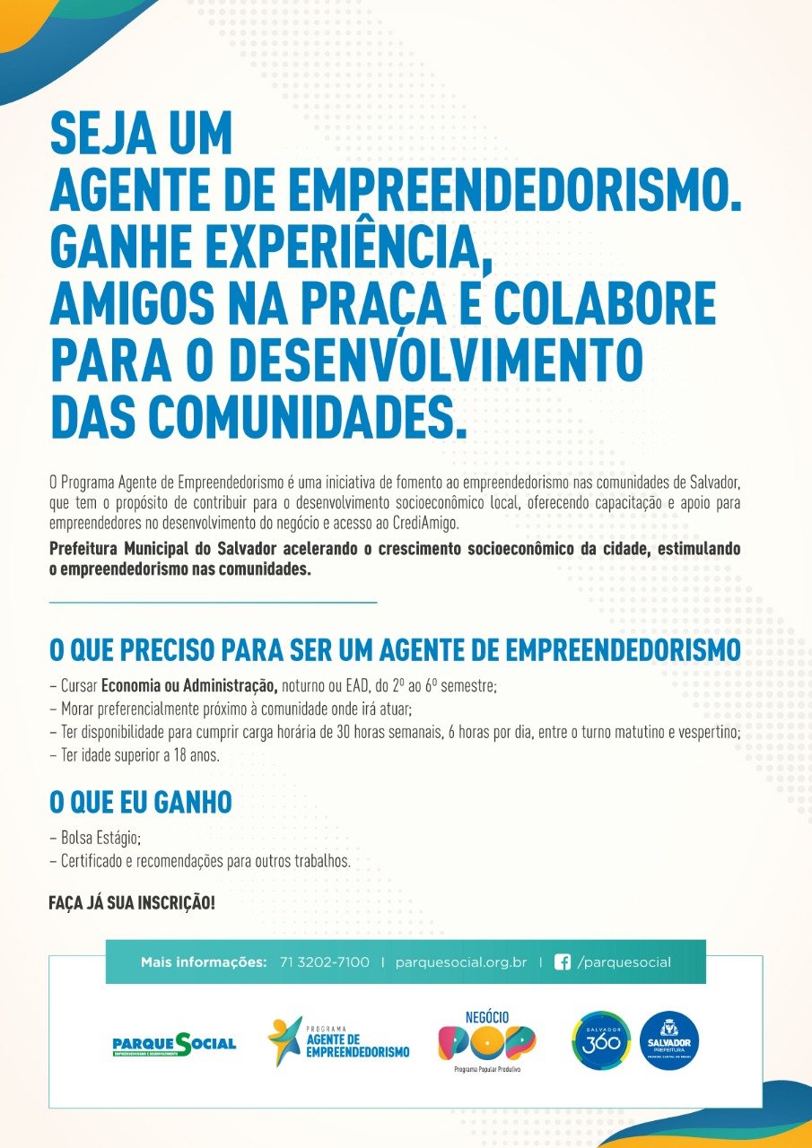 O estagiário desenvolverá as atividades no programa Agente de Empreendedorismo, mediante Acordo de Cooperação Técnica com o Parque Social. As atribuições visam proporcionar experiência prática de aprendizagem, sendo elas supervisionadas. O objetivo é que seja garantido ao estudante vivências na área de desenvolvimento socioeconômico, através de estímulo ao empreendedorismo.
